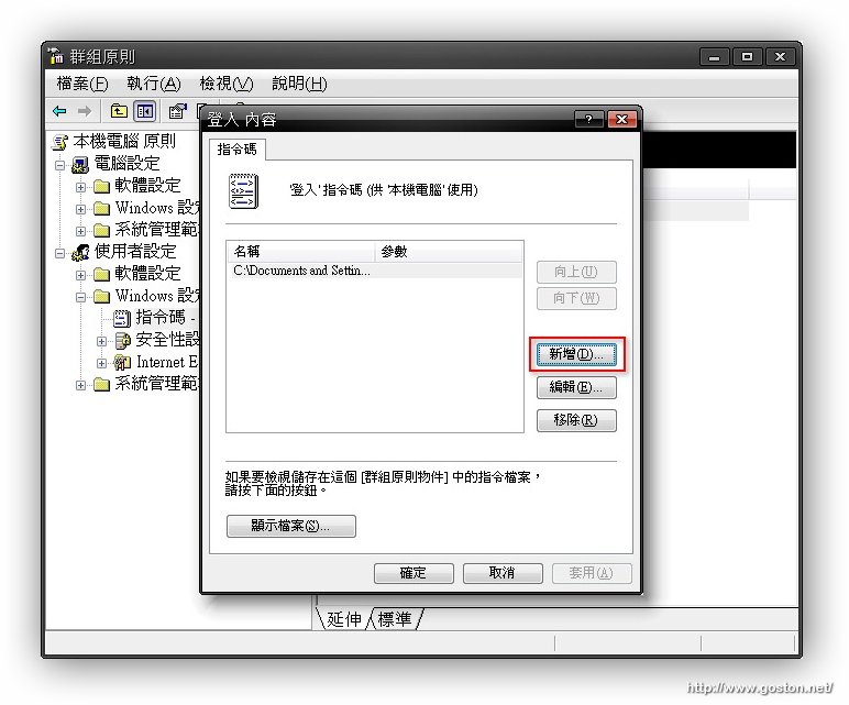備妥這兩個檔後, 接下來就是要設法讓這兩個檔分別於開關機時自動執行, 我個人是透過 Windows 的「群組原則」來達成這個目的, 若你使用的 Windows XP 是 Home Edition 可能會無此功能 (不確定, 沒用過), 請自行尋找替代的軟體來做。