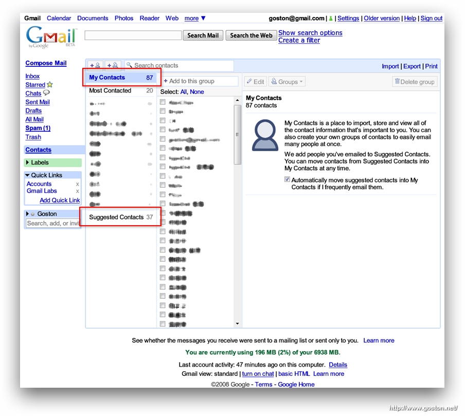 「Google」顯然是聽到大家的訐譙聲了! 現在「Gmail」的通訊錄清單已被區分為兩大塊:「My Contacts」及「Suggested Contacts」: